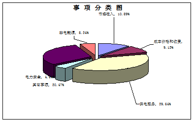 2268件有(yǒu)效信(xin)息按事項(xiang)類别劃分(fēn),供電(dian)服務(wu)899件,占39.64%;市(shi)場(chang)準入247件,占10.89%;電(dian)力(li)安(an)全103件,占4.54%;成(cheng)本(ben)價格咊(he)收費207件,占9.13%;非(fei)電(dian)能(néng)源121件,占5.34%;其它事項(xiang)691件,占30.47%。
